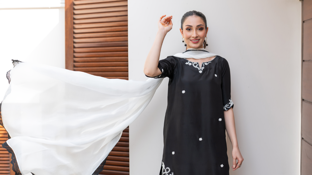 Fabric Details Kameez & Shalwar : Butter Silk Dupatta : Medium Silk Black, bold, and beautifully classic — this Eastern silk stunner with white embroidery and trending farshi shalwars (can be replaced with straight pants) is your Eid dinner must-have! Timeless vibes with a...- Rs33,000.00PKR