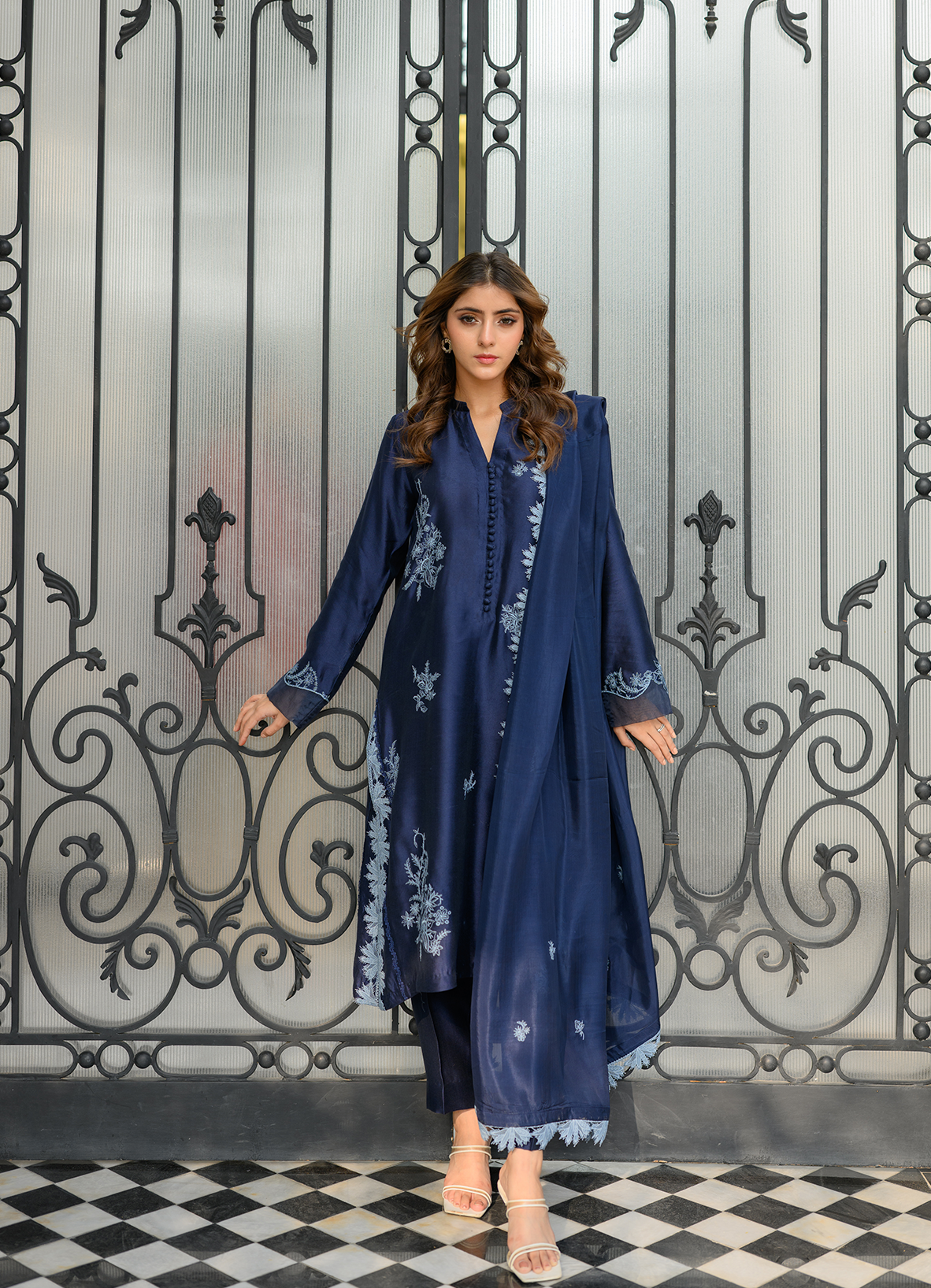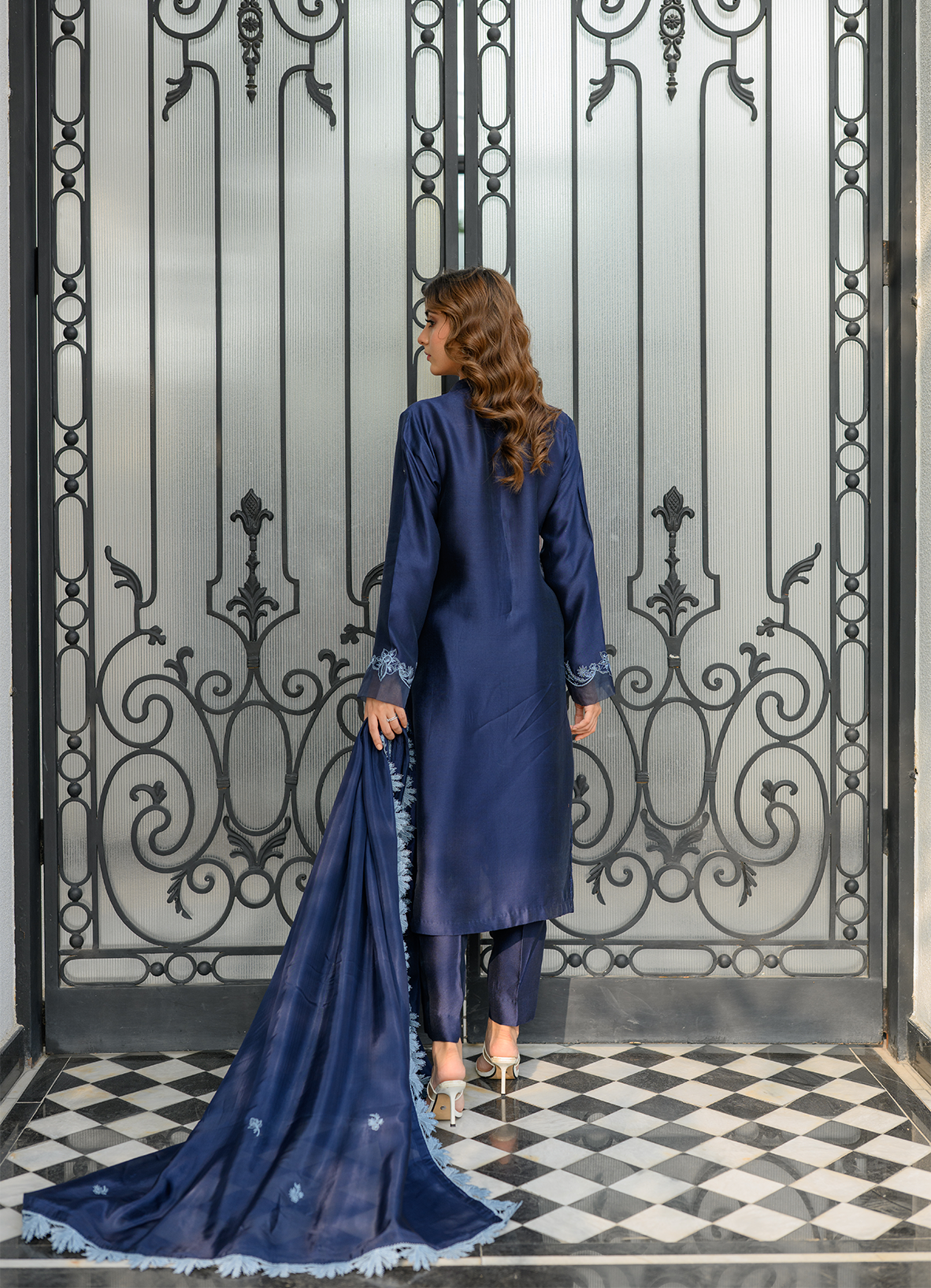 Meher is an expression of quiet beauty, where delicate craftsmanship meets refined elegance. Crafted in luxurious khaddi silk, this three-piece ensemble is adorned with subtle blue accents in embroidery, lending softness and depth to the overall design.