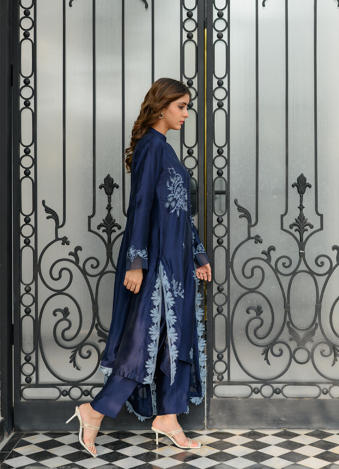 The highlight of the outfit lies in its organza appliquéd embroidered sleeves, thoughtfully detailed to add texture and feminine charm. A medium silk dupatta, finished with embroidered motifs along the pallu, complements the look with effortless grace. Fine lace finishes on both the shirt and dupatta bring the ensemble together, enhancing its delicacy and polished appeal.