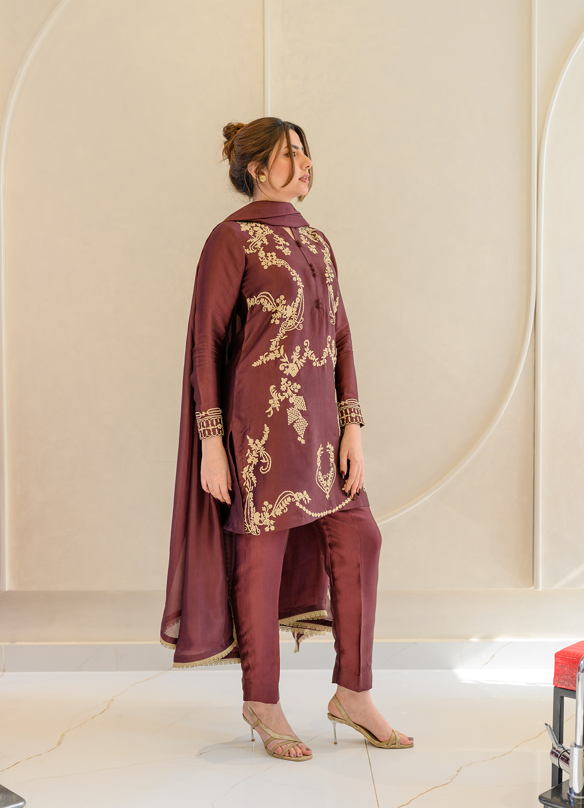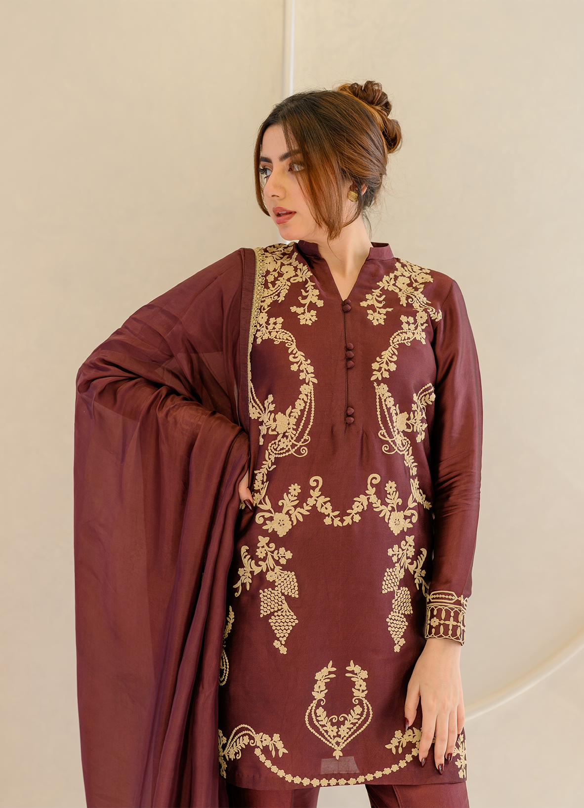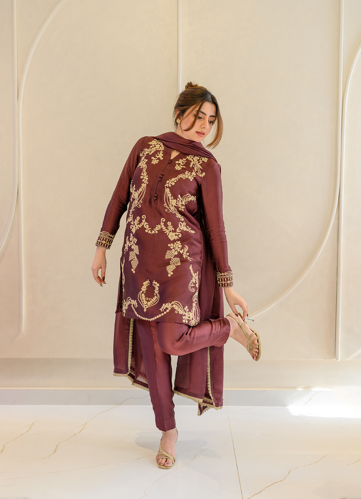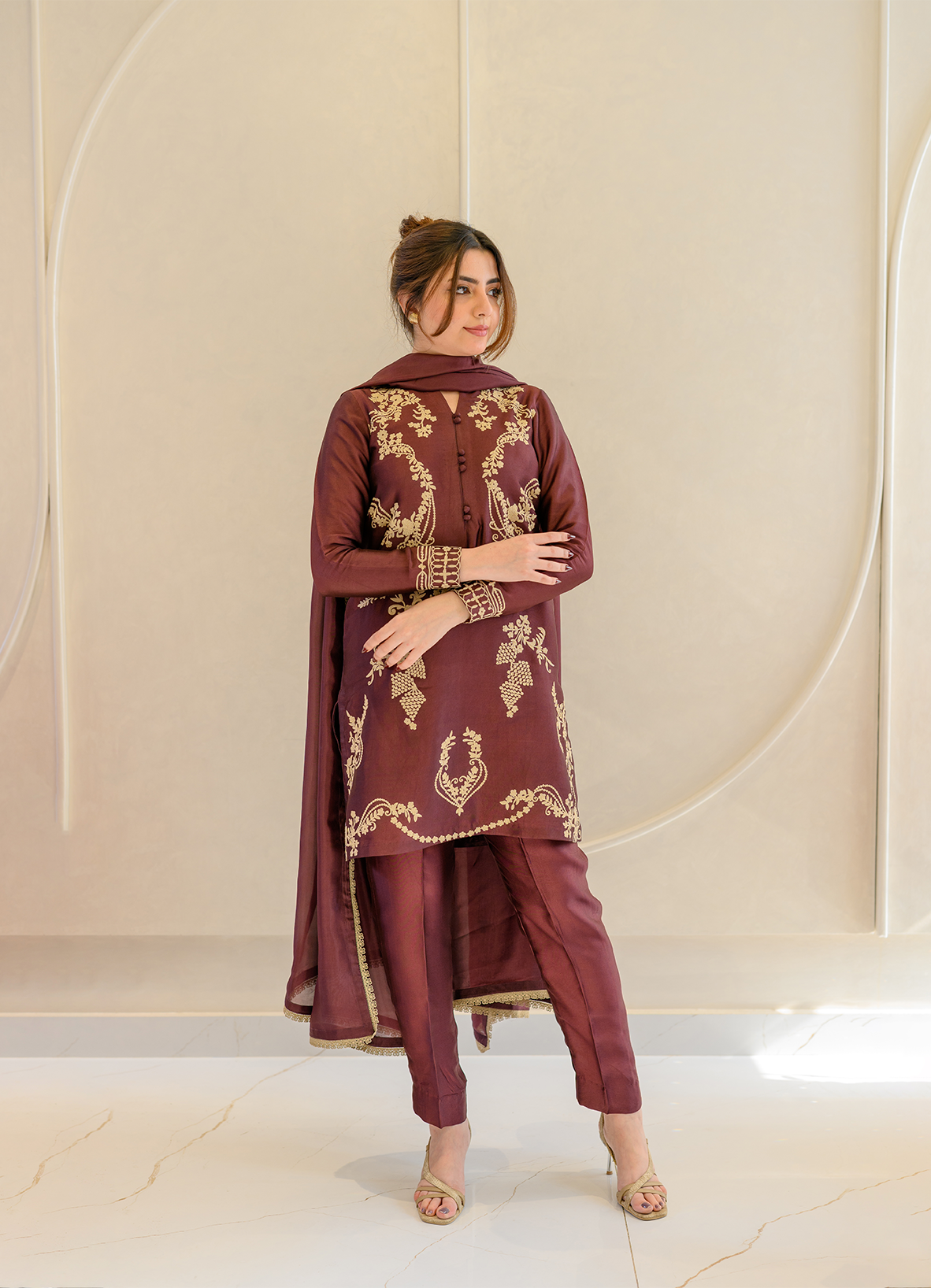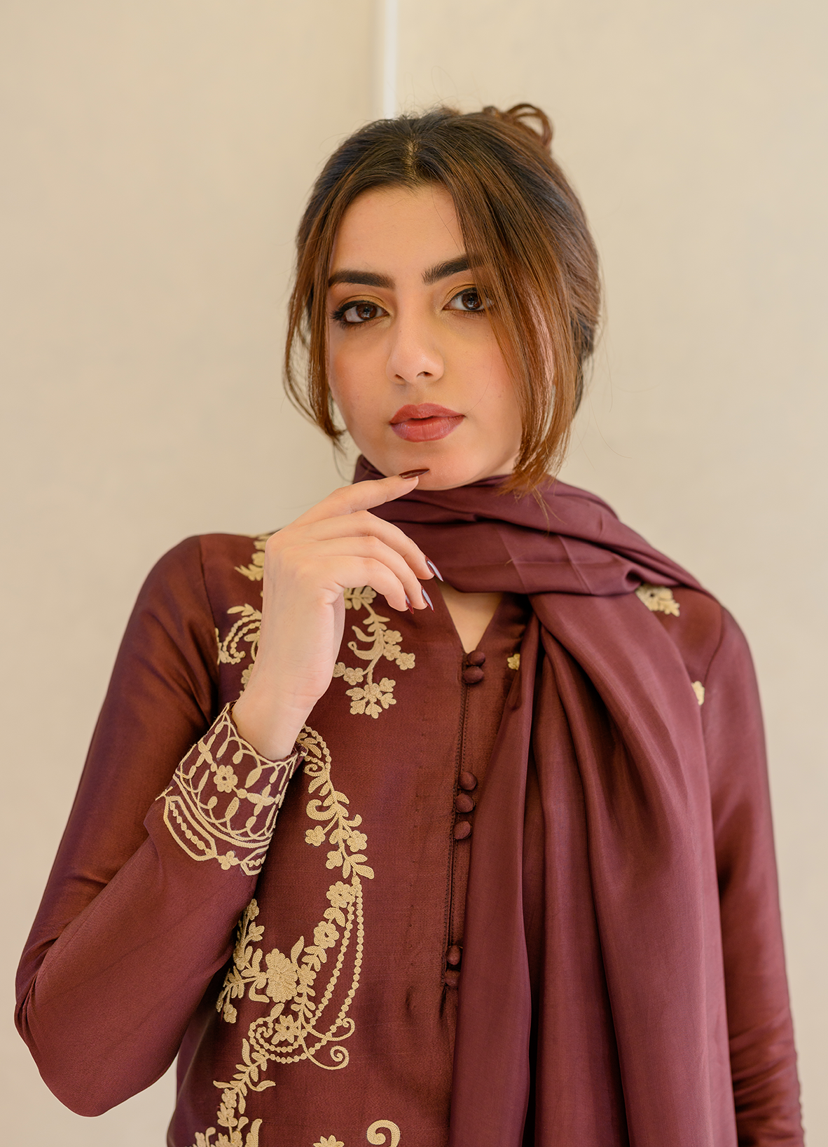 Riwayat is a tribute to heritage craftsmanship, reimagined for the modern woman. Rendered in a rich maroon-brown palette, this design features intricate aari embroidery that draws from traditional techniques while embracing clean, contemporary cuts.